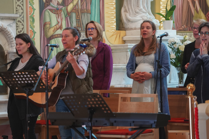 Az előadást követően gitáros szentségimádás, majd szentmise következett, amelyet Varga László püspök és Varga Péter plébános mutatott be.