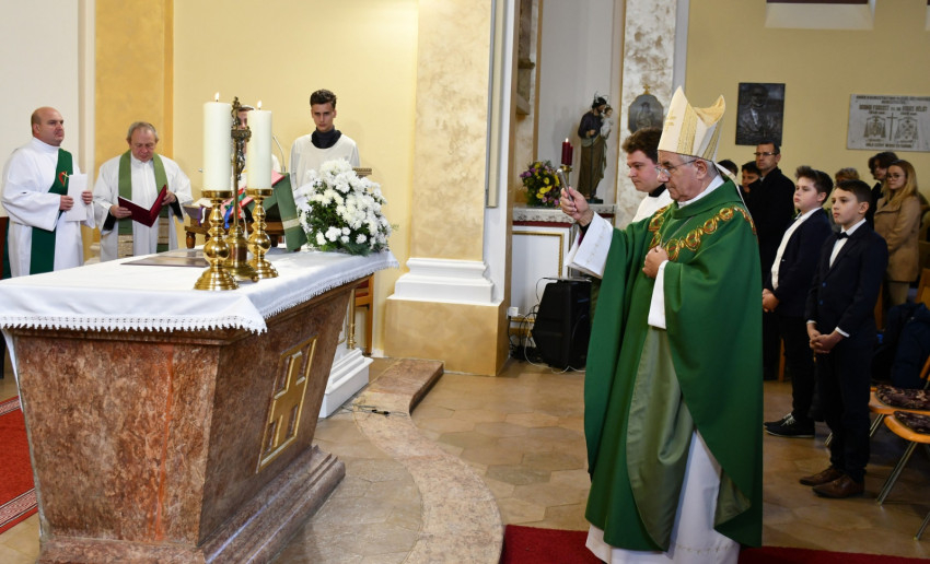 A szentmise kezdetén a püspök megszentelte a vizet, amellyel meghintette a templom belső falait, az új oltárokat és a híveket. „Hallgasd meg itt egybegyűlt közösséged imádságát, és áldd meg ezt a felújított templomot. Add, hogy a hívek itt megtapasztalják közelségedet és szeretetedet. Erősítsd meg őket az egységben” – hangzott el a megáldási szertartáson.
