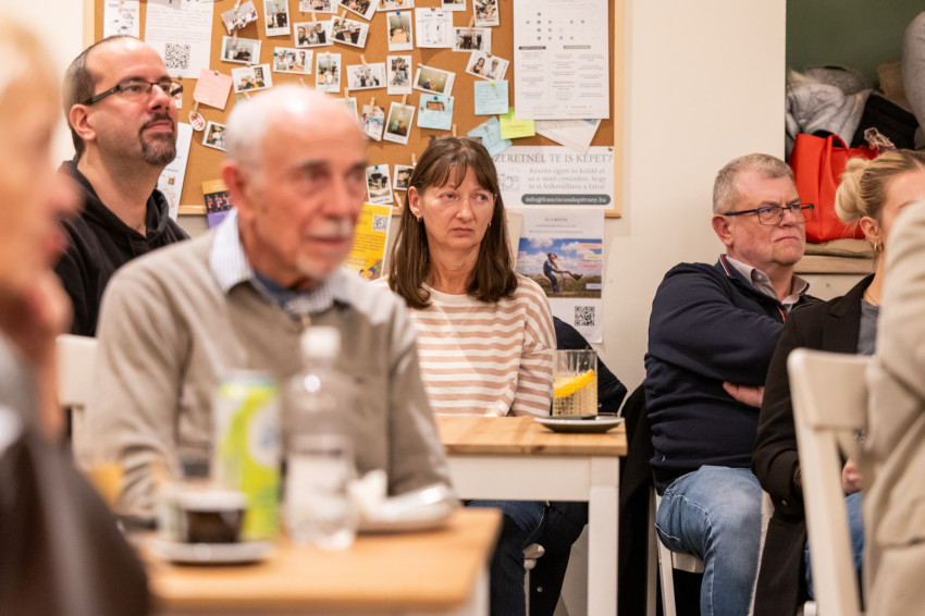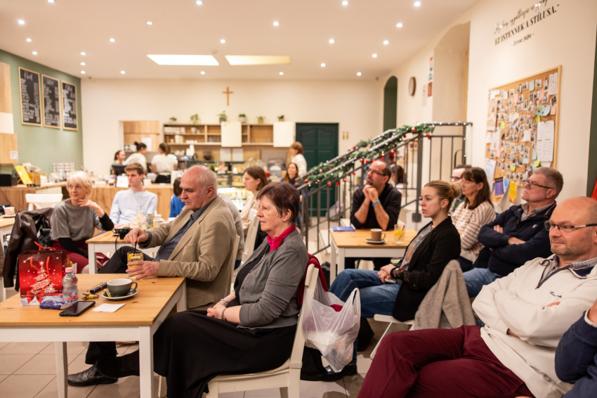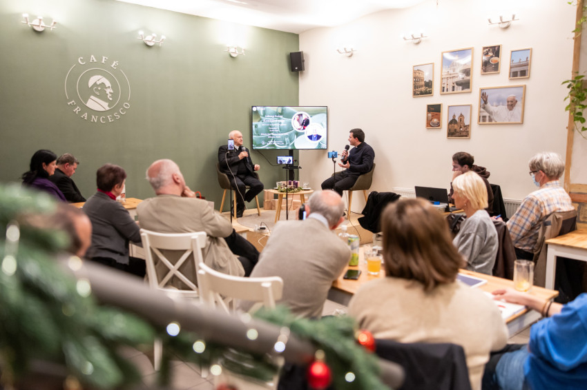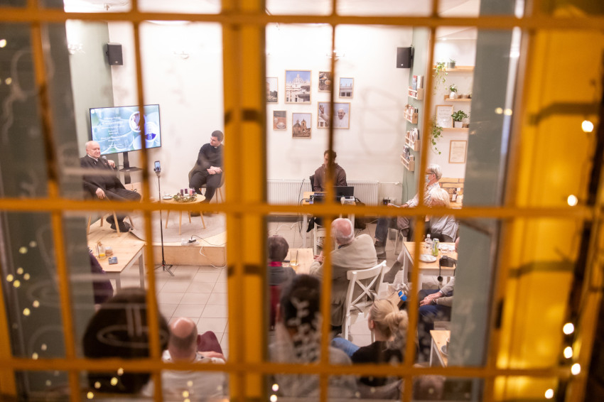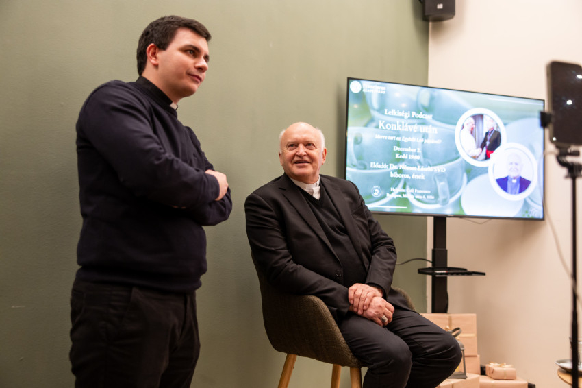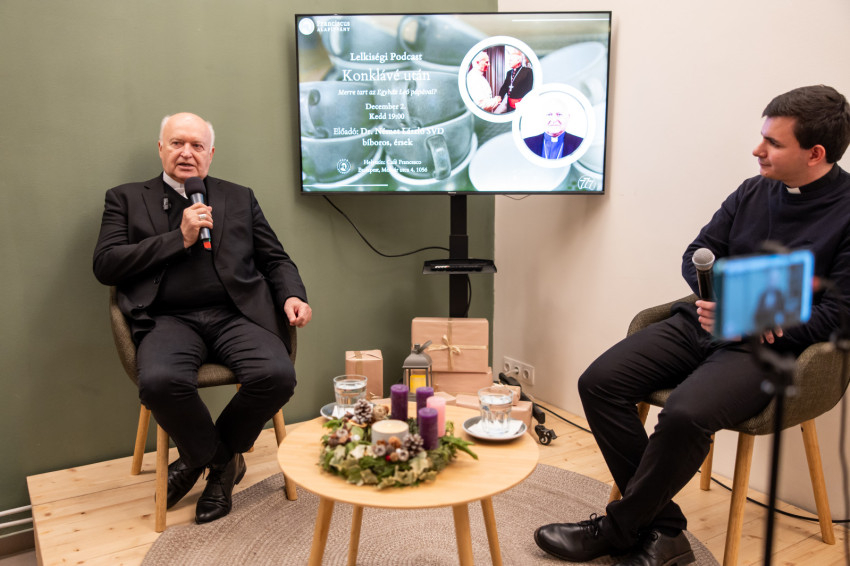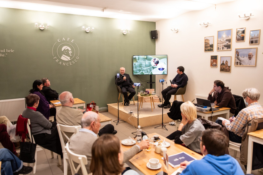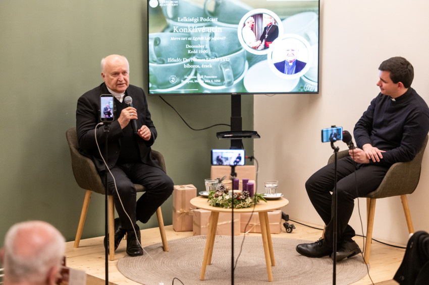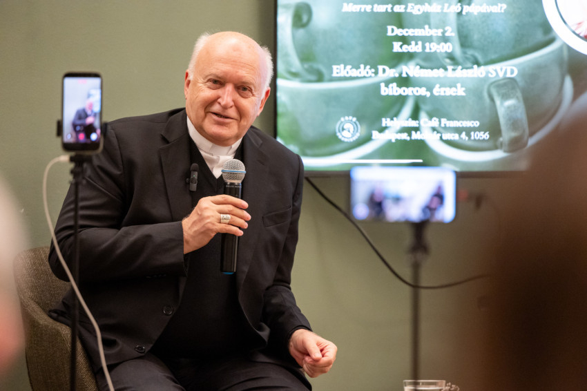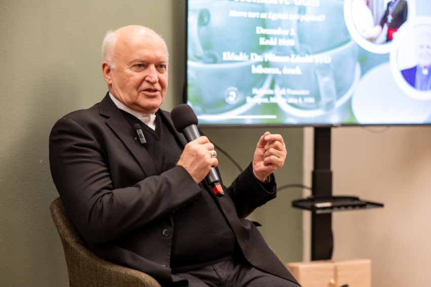 A Konklávé után. Merre tart az Egyház XIV. Leó pápával? címmel megtartott nyilvános beszélgetés elején Német László bíboros életútját ismerhette meg a kávézó közönsége.