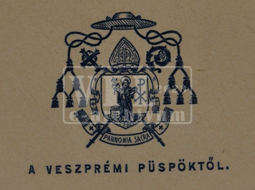 A címer alatti szalagon a püspöki jelmondat olvasható: Pannonia sacra. Az andráskereszt alakban elhelyezkedő kereszt és pásztorbot mintegy címertartó funkciót tölt be. A címer felett a zöld püspöki kalap lebeg hat-hat bojttal.