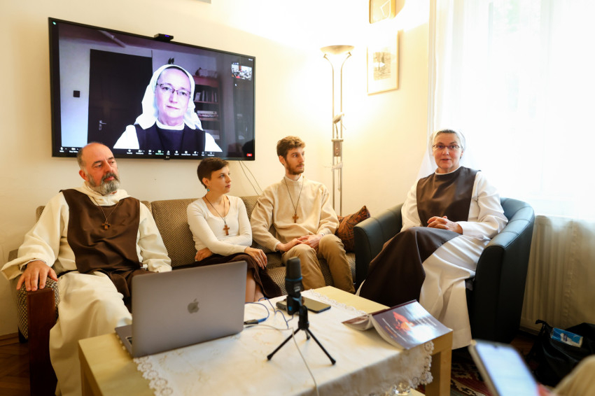 Az Örökimádás-templom papi lakásában ülünk le beszélgetni Szeidel Péterrel, a Nyolc Boldogság Közösség egyetlen magyar papjával, a templom igazgatójával, valamint Kárpáti Zsuzsannával és férjével, Kiss Attilával, a közösség magyarországi laikus ágának felelőseivel. Éppen Budapesten tartózkodik Versegi Beáta Mária CB nővér, aki az újonnan alapított pécsi házban él, és hogy valamennyi magyar ház képviseltesse magát ezen az alkalmon, online csatlakozik a beszélgetésünkhöz Bajnóczi Szilvia Sára CB nővér, a homokkomáromi ház felelőse is.