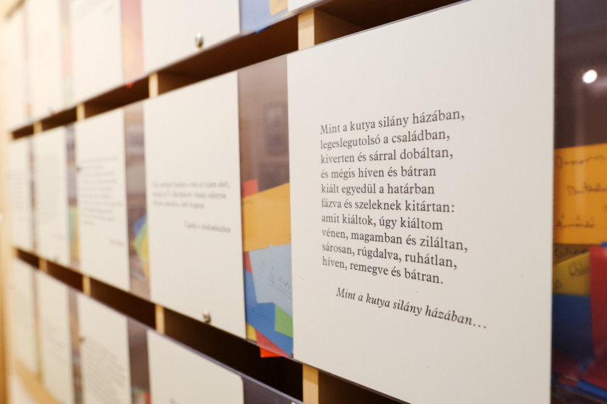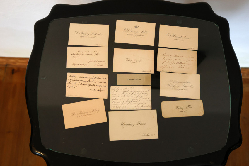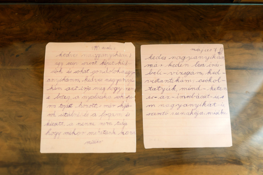 Az egyik vitrinben névjegyek és rövid üzenetek láthatók a család barátaitól. Lovas Csilla szerint ilyenek voltak a korabeli sms-ek.