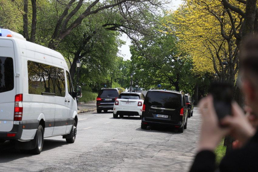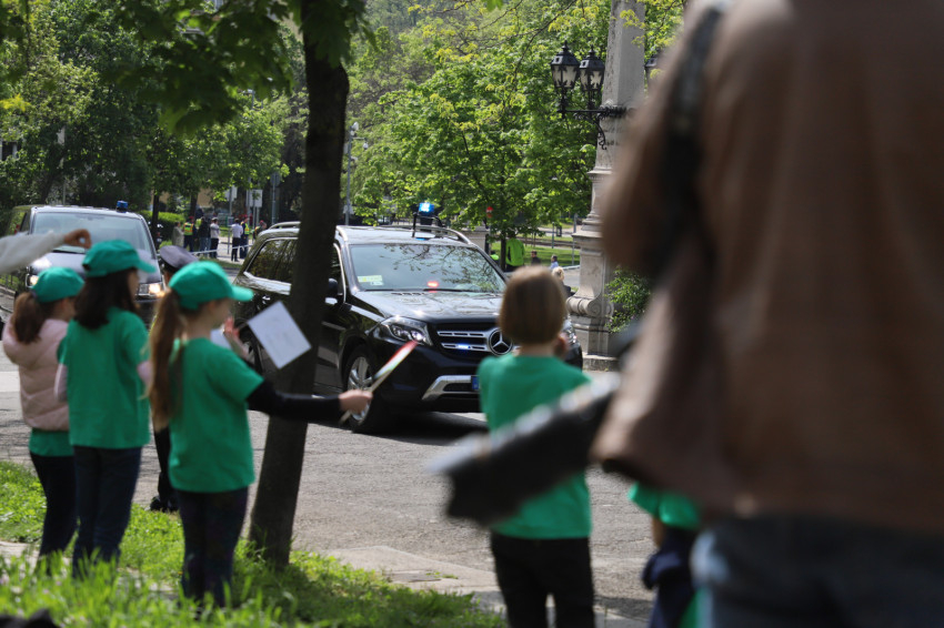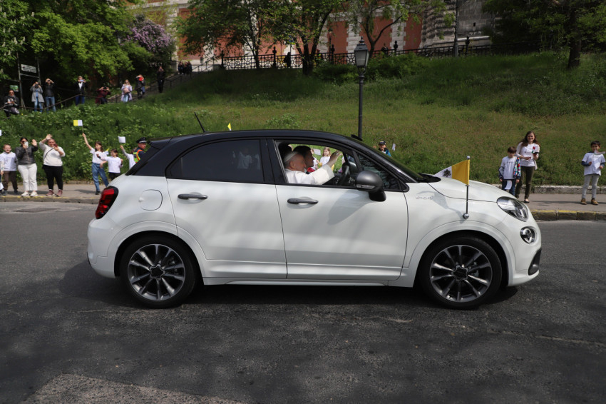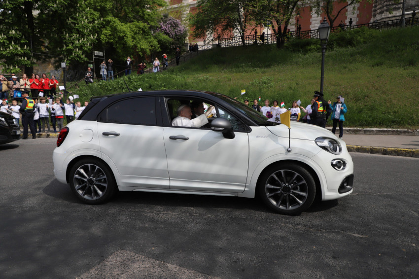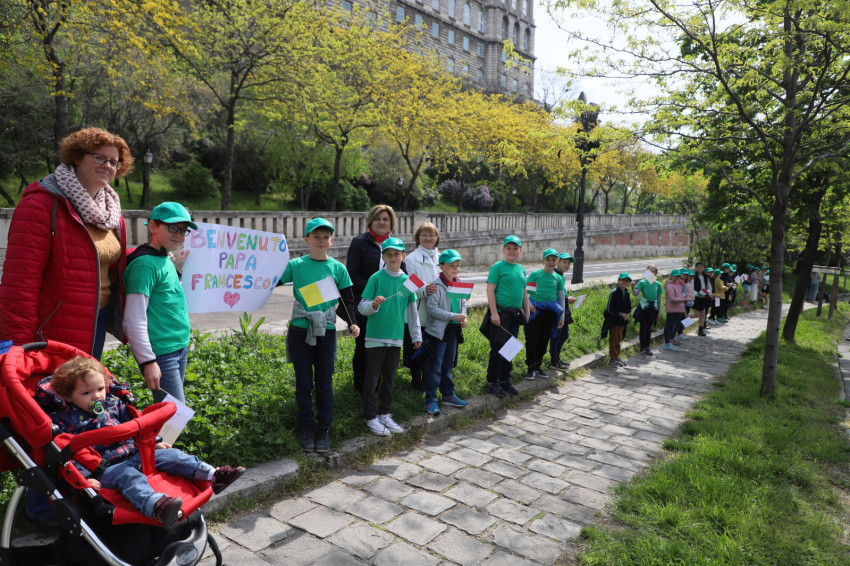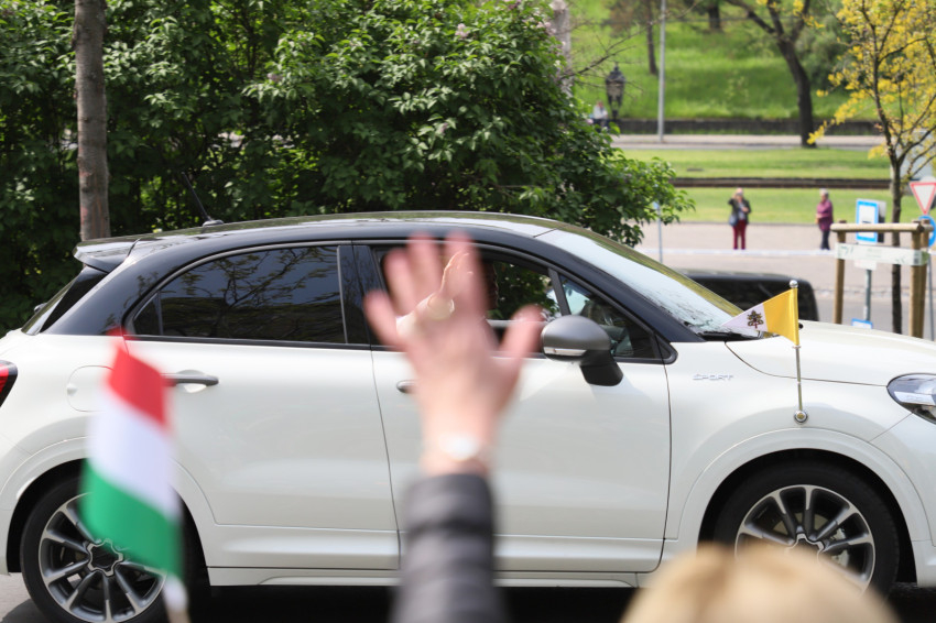 A pápai konvoj elhaladt a kis zászlókkal integető diákok és tanárok sorfala között, miközben a Szentatya a nyitott autóablakon át integetett feléjük, áldást adott, majd a kocsisor felkanyarodott a Palota úton, továbbhaladva a Sándor-palota felé.
