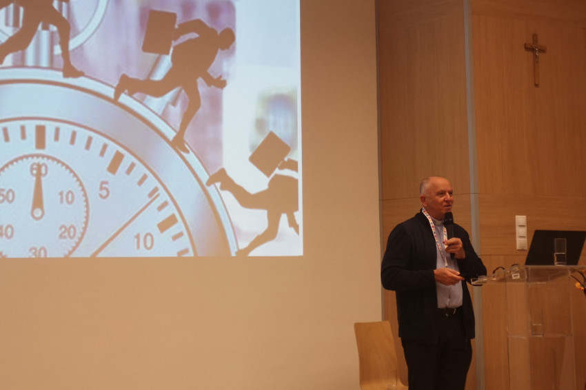 Csáki Tibor atya egy meserészlettel indította előadását Michael Ende Momó című könyvéből. A történetben a szürke ruhás urak lopják el az emberek idejét, és Momó, a kislány elindul, hogy visszaszerezze. Nem mindegy, hogyan éljük meg az időt: telik-e, vagy múlik.