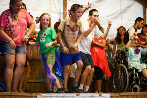 – Tíz csoport van. A „régi motorosok” kapják a nehezebb eseteket, hozzájuk próbálunk újabb résztvevőket beszoktatni. Egy csoportban huszonhárom fő van: három csoportvezető, tíz táborozó gyerek és tíz önkéntes. A csoportvezetők ügyesen beosztják, ki kivel, hogyan foglalkozik. Vannak, akik huszonnégy órás felügyeletet igényelnek, vannak, akik egész nap elbóklásznak egyedül, vagy leülnek rajzolni. Jobbára közép- és enyhe fokú sérültek a táborozóink, de vannak súlyosabbak is.