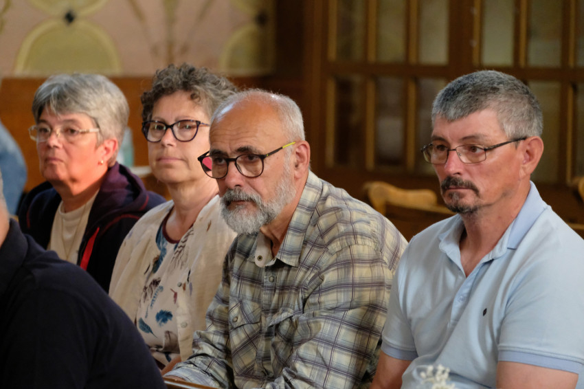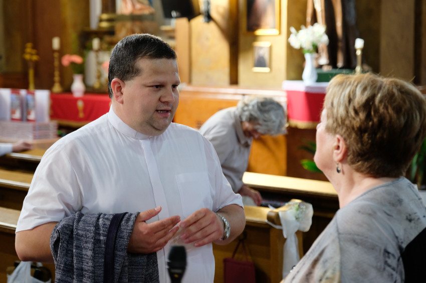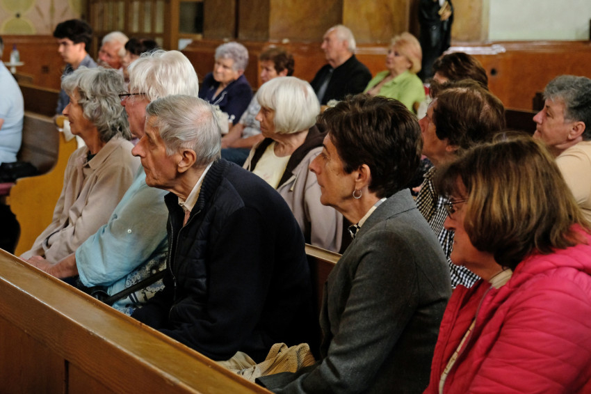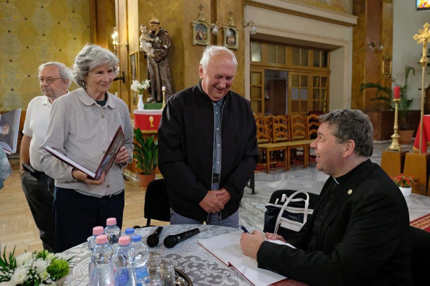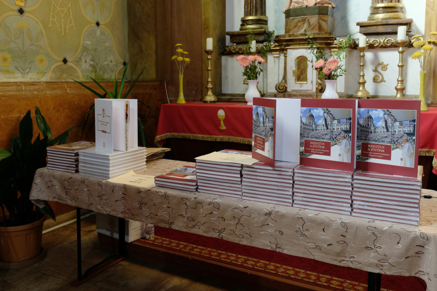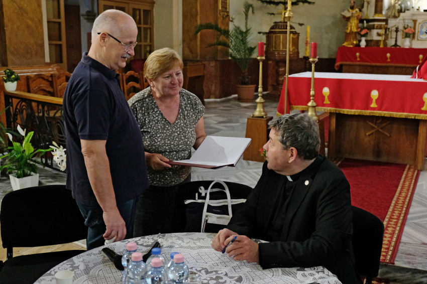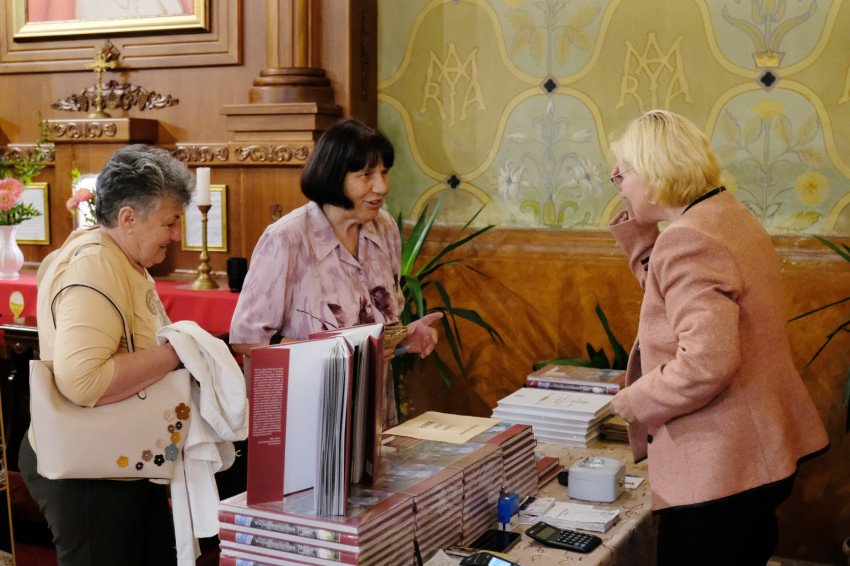 Az ajtóban Tóth Tibor plébános fogadja az érkezőket, mindenkivel vált néhány szót. Érdeklődőek az emberek, már az elején többen vásárolnak a díszkötetből.