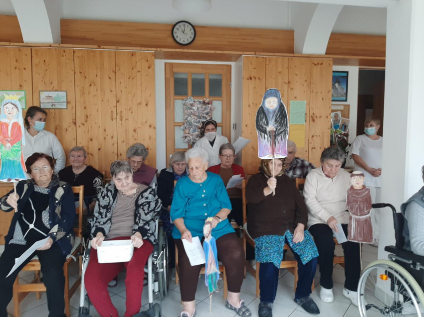 Az adventi koszorú gyertyáinak közös meggyújtása, a sok-sok készület Jézus születésére, mint egy-egy kis apró mécses világít jelenünk fájdalmas, sötét éjszakájában, amikor nap mint nap sokan meghalnak a zsúfolt Covid-osztályok lélegeztetőgépein. A délután 4 órai imaóra Marianna nővér vezetésével lakóink egyik legkedvesebb foglalatossága. Most naponta az irgalmasság rózsafüzérével és Jézus Szent Vérének litániájával könyörgünk, és átérezve mulandó voltunkat a mennyei karokhoz társulva mondjuk: Szent Isten, Szent erős Isten, Szent halhatatlan Isten, könyörülj rajtunk és az egész világon!