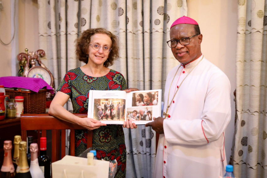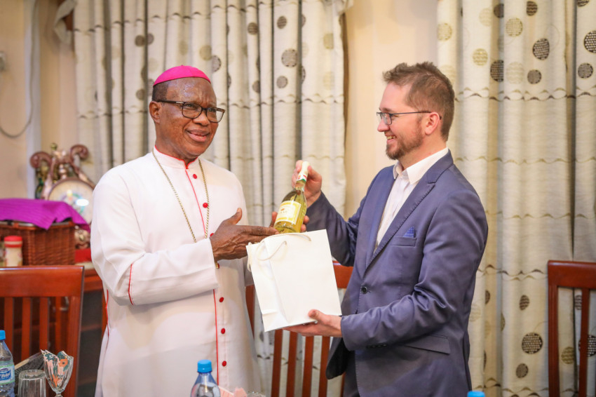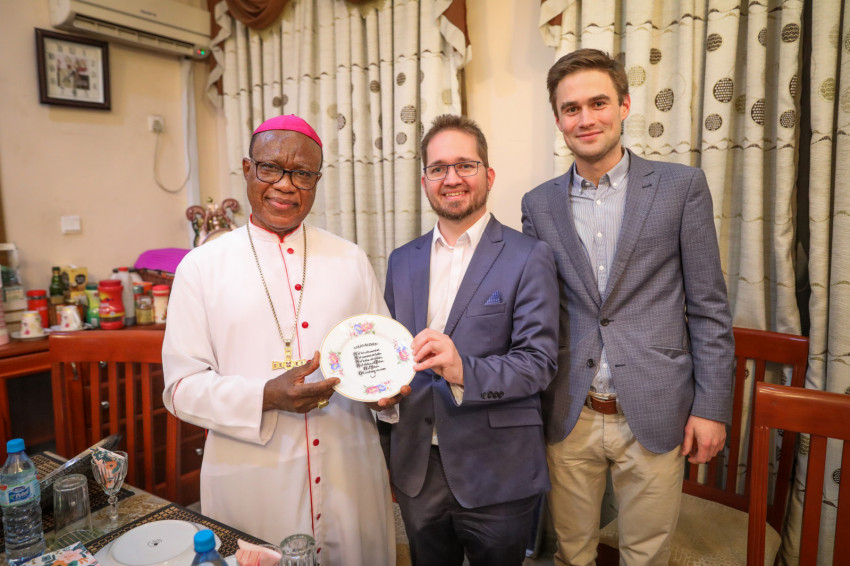 A Magyar Kurír nevében a Jöjjetek és lássátok! – A budapesti 52. Nemzetközi Eucharisztikus Kongresszus a képek tükrében című kötetet ajándékoztuk az érseknek, aki meghívott előadója volt a kongresszusnak. Az ajándékozást és a vacsorát követően Okeke érsek nagy szeretettel köszöntötte a magyar vendégeket egyházmegyéjében, ahol az országban a legnagyobb a katolikusok aránya. Megköszönte, hogy Isten Szentlelkének hívására eljött a misszió Onitshába, hogy orvosi és humanitárius segítséget nyújtson az itt élőknek. Kiemelte, mennyire fontos számára az oktatás – több mint 400 iskolát működtetnek – és az egészségügy.