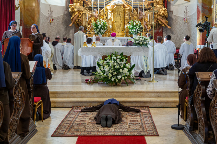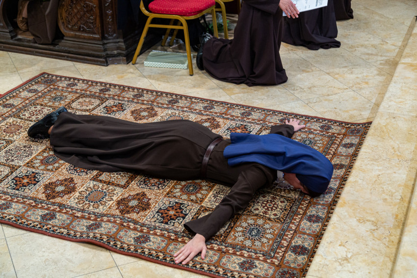 A homília után a szerzetesi élet lényegére vonatkozó kérdések következtek, majd a Mindenszentek litániája alatt a fogadalmas kitárt karral leborult a földre az Istennek való teljes önátadás jeleként.
