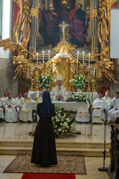 És Jézus példájára be kell mutatkoznunk, meg kell mutatnunk a valónkat, hogy kik vagyunk. Mint ahogy ő is bemutatkozott és ragyogott. A fényességtől olyan volt a ruhája meg az arca, mint a nap. Valljuk meg mi is minden alkalommal, amikor lehetőségünk van rá, hogy hová tartozunk, mert a hitünk nem magánügy. Krisztina nővér felment a hegyre, és vele együtt a mai szent liturgiában mi is mindannyian felmegyünk erre a hegyre azért, hogy meglássuk Krisztus ragyogását, hogy ő fizikai valójában, mi pedig lélekben leborulunk Jézus Krisztus előtt. Erősítse meg mindannyiunkban Jézus Krisztushoz és az ő Egyházához való tartozásunkat, az Egyház iránti elköteleződésünket ez az örökfogadalom-tétel, és imádkozzunk Krisztina nővérért, hogy az Úr jutalmazza meg őt, adjon a lelkébe mindig örömet és békességet, hogy egész életén át tüzes lelkűen tudja szolgálni az Urat! – buzdított Ternyák Csaba.