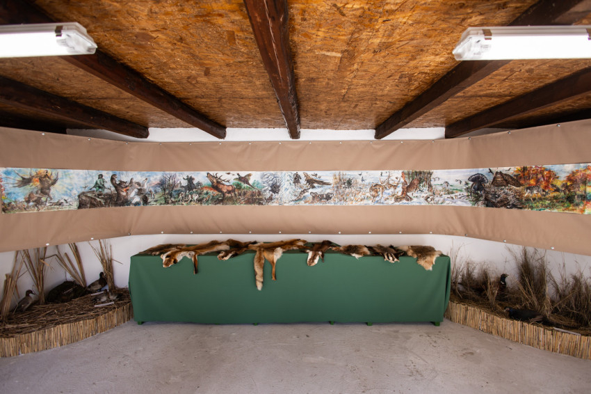 A halászat és vadászat témakörében is bemutatnak kitűnő grafikákat, többek között Szőnyi István, Győri Miklós, Kórusz József rézkarcait. Állatokat ábrázoló kerámiák, kisplasztikák, porcelánfigurák gyűjteményének is otthont ad az emlékház. A galériában látható festmények döntő többsége azonban Rádóczy Gyarmathy Gábor festőművész munkája. „Ő úgy festette meg a vadakat és a vadászjeleneteket, hogy maga is része volt a természetnek. Fiatalon solymászatot tanult, lovagolt, horgászott, vadászott, megfigyelései jó alapot nyújtottak művei létrehozásához. Itt látható a hátsó teremben a vadászat története körképének a vázlata.”
