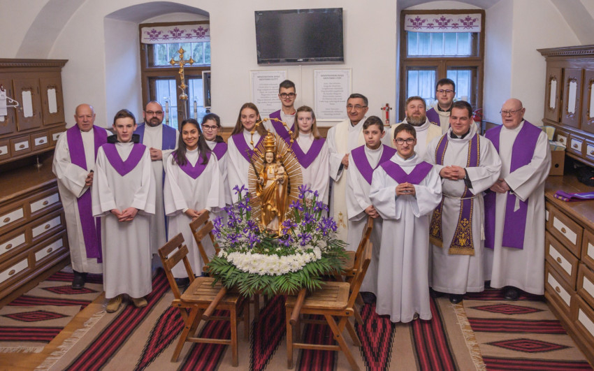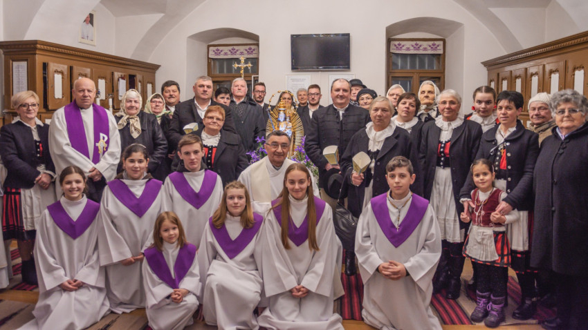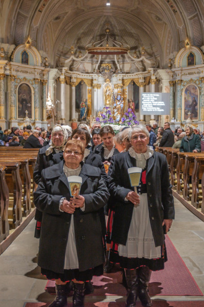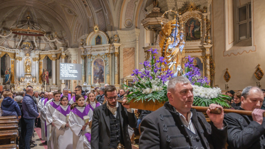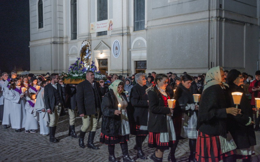 A szentmise után ugyancsak a csíkszentsimoni és a csatószegi egyházközség tagjai vezetésével a fájdalmas rózsafüzért imádkozták a zarándokok. A gyertyás körmenetben népviseletbe öltözött férfiak vitték a Szűzanya kegyszobrának másolatát. Az elsőszombati Mária-köszöntőt a Mária Rádió és a kegyhely YouTube-csatornája élőben közvetítette. A következő Mária-köszöntő április elsején lesz.