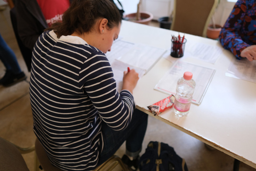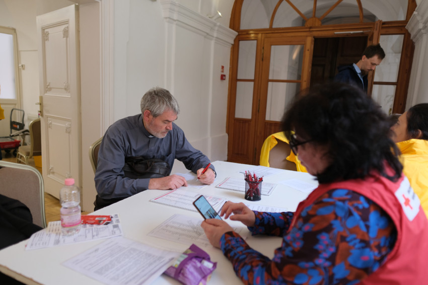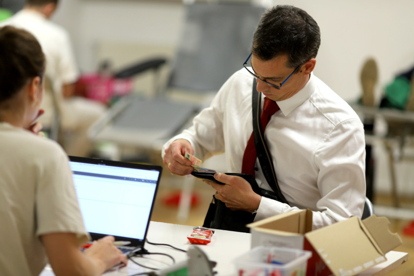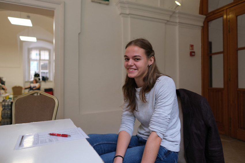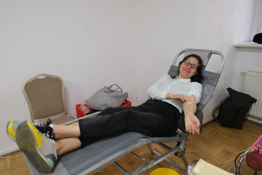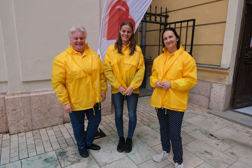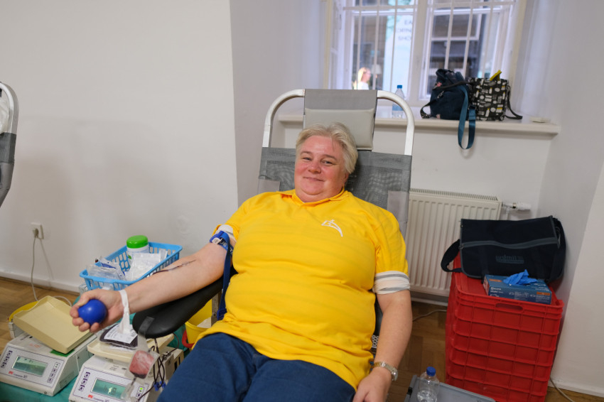Ottlétünk idején folyamatosan érkeztek a véradók. Nemcsak az ágyak voltak egyfolytában foglaltak, de a regisztrációs asztaloknál vagy az adatlapok kitöltésénél is mindig ült valaki, még az ajtóban is sorban álltak. Így az önkéntes segítők munkájára is nagy szükség volt: ők fogadták és irányították az embereket. A Műegyetemi Katolikus Közösség (MKK) önkéntes munkacsoportjának egyik vezetője, Husznai Mirjám elmesélte, hogy a tavalyi Forrásponton hallott először a KATTÁRS-ról, és már nagyon kíváncsi volt a rendezvényre. Ezért amikor felkérték őket, hogy önkéntes munkájukkal segítsenek a szervezőknek, készségesen vállalta a feladatot. Még nem volt soha véradáson, izgalommal várta a mai napot. „Most ugyan csak önkéntesként vagyok jelen, de nem kizárt, hogy ma lesz az első véradásom.”