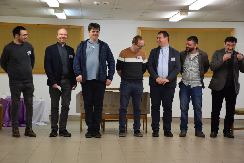 A püspökség több részlegéből, irodáiból érkeztünk. Noha sokszor találkozunk egymással az épületben, a lelkinapot ismerkedő játékokkal kezdtük, hogy az igazán „lényeges” kérdésekben is megismerjük egymást: ki a balkezes, ki főzött tavaly lekvárt, ki épített már homokvárat, kinek milyen hosszú a haja vagy mekkora a cipőmérete?