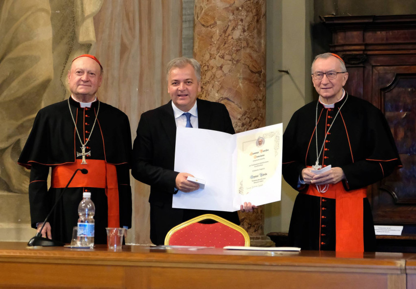 Gianfranco Ravasi és Pietro Parolin bíborosok a pápai aranyérem átadásakor 2022-ben
