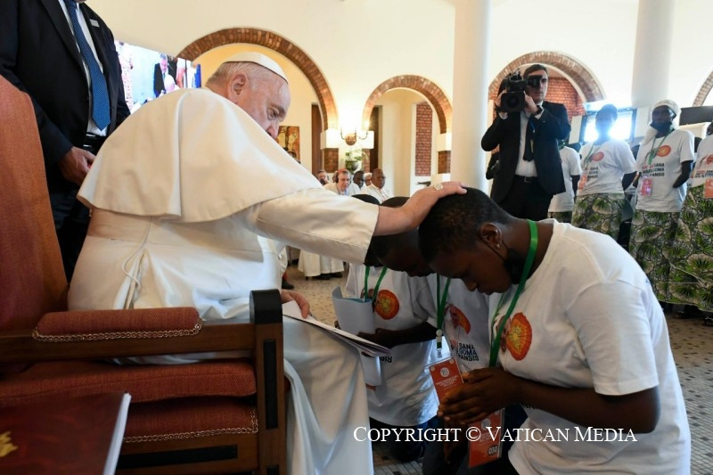 Az első tanúságtevő, a 17 éves Ladislas Kambale Kombi hátborzongató eseményekről számolt be: idősebb testvérét máig ismeretlen körülmények között ölték meg, apját katonaruhába öltözött férfiak lőtték le. Ő maga szemtanúja volt ennek, azóta nem tud aludni. Látta, ahogyan a támadók feldarabolták az apját, majd levágott fejét kosárba tették, és magukkal vitték az anyját, aki azóta sem tért vissza. Így ő és két kishúga egyedül maradtak. „Nehéz megérteni ezt a gonoszságot, ezt a szinte állati brutalitást” – mondta, és bemutatta a pápának a többi fiatalt, akik hozzá hasonlóan átélték az erőszakot. Hozzátette, hogy a helyi egyház adott nekik lelki segítséget és így meg tudtak bocsátani kínzóiknak: „Ezért teszem le a győzedelmes Krisztus keresztje elé ezt a bozótvágó kést, egy ugyanolyat, mint amelyik megölte az apámat”.