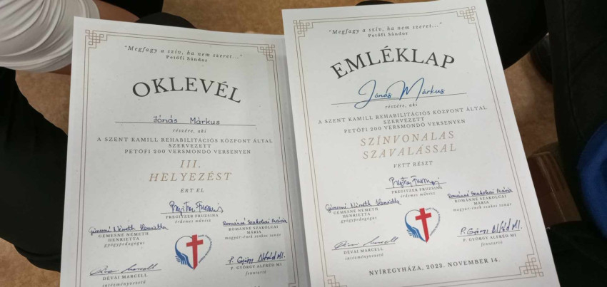 A Petőfi 200 versmondó versenyen a Szent Kamill Rehabilitációs Központ gondozottjai közül Bertók Katalin harmadik, Hutkai Gyula pedig második helyezést ért el.