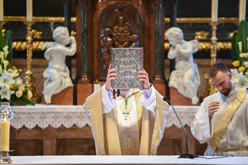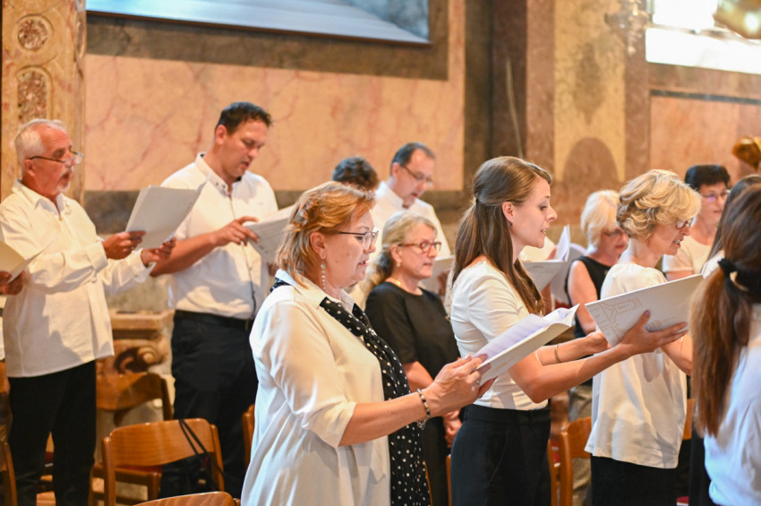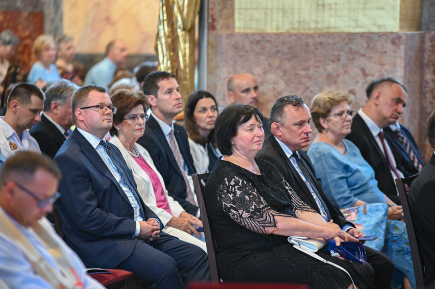 A Szent Lászlót méltató ének után a nagyváradi püspököt köszöntő kórusmű közben vonult be az asszisztencia és a papok hosszú sora a gyönyörűen felújított, teljes pompáját visszanyert székesegyházba.