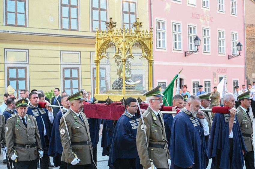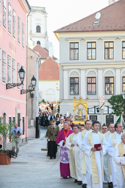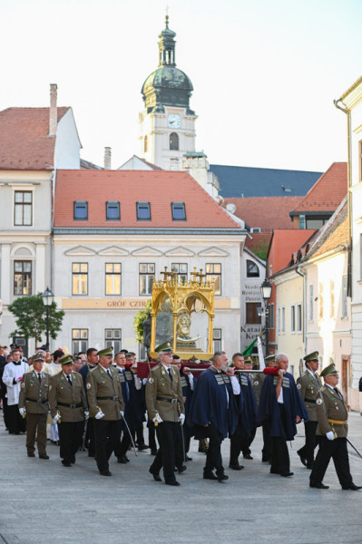 A szentmise végén elindult a körmenet a székesegyházból a fúvószenekar által kísért Isten, hazánkért kezdetű, népünkért könyörgő énekünkre. A körmeneti keresztet és a gyertyát az asszisztencia, a koncelebráló papok hosszú sora, a Szent László Lovagrend és a polgárőr testület követte. Szent László király hermája után vonultak a püspökök és a fúvószenekar, valamint a város elöljárói és a zarándokok utcahosszakat betöltő sora. A körmenet a Káptalandombról indulva a Bécsi kapu teret, a Király utcát, a Dr. Kovács Pál utcát és a Jedlik Ányos utcát érintette.