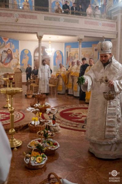 Az utrenye végén a főpásztor megszentelte a pászkáskosarakat, és a szentelt vízzel a híveket is meghintette.