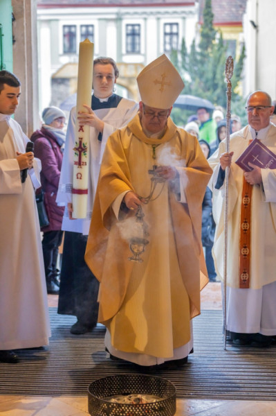 A húsvéti vigíliaszertartás a szombathelyi székesegyház előtt a tűzszenteléssel kezdődött. Ezt követően Székely János megyéspüspök és az asszisztencia a húsvéti gyertyával – Krisztus világosságával – bevonult a templomba.