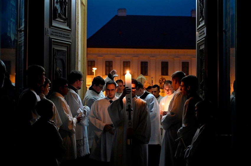 Nagyszombat este Varga László megyéspüspök mutatott be vigíliaszentmisét a kaposvári Nagyboldogasszony-székesegyházban. A szertartás a tűzszenteléssel kezdődött, majd a papság és az asszisztencia a húsvéti gyertya, Krisztus világossága fényénél vonult a szentélybe.