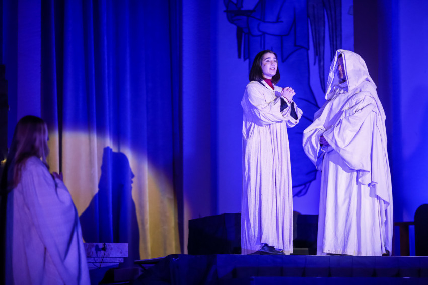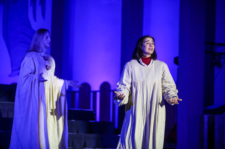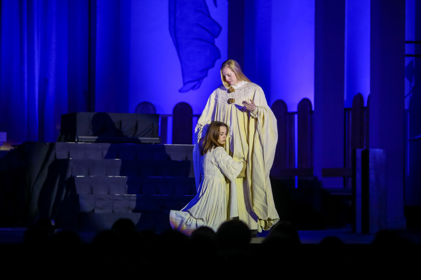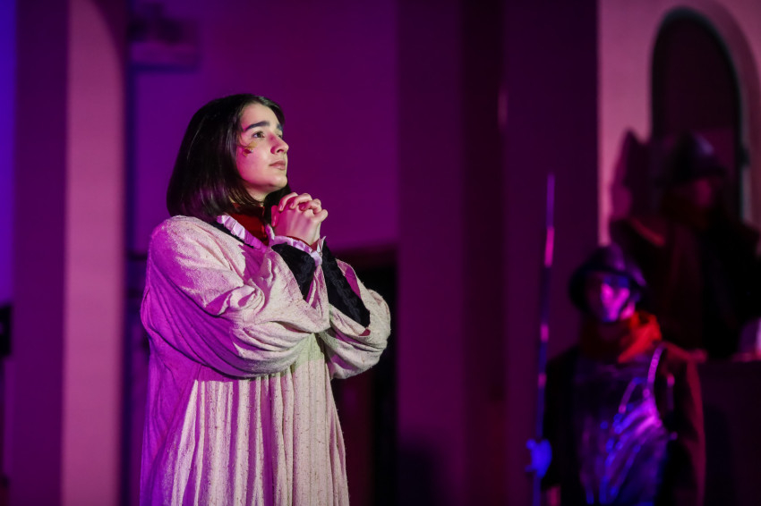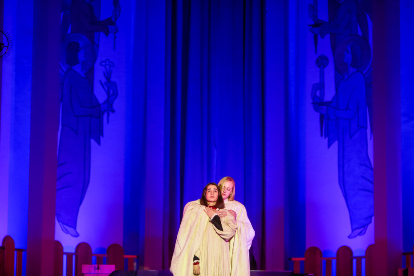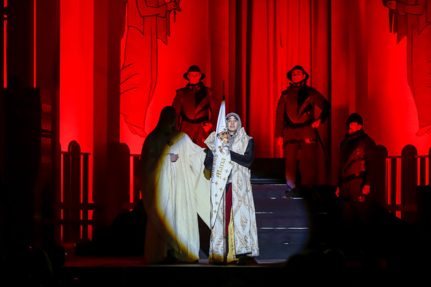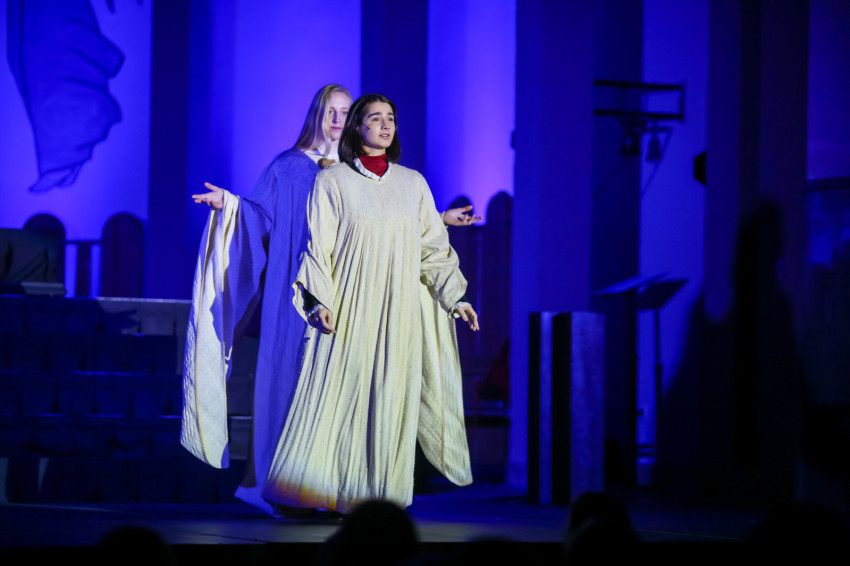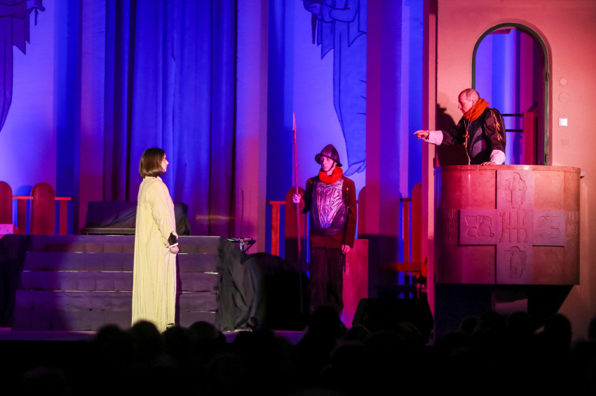 A misztériumjátékot mintegy hatvan szereplő adja elő. Meskó Zsolt eredeti ötlettel megkettőzi Jeanne d’Arc személyiségét: az első Jeanne a cselekvő, míg a második mintha a mából emlékezne vissza a történtekre, üdvözült lélekként. A cselekvő Jeanne-t a tizenkilenc éves Ménesi Júlia játssza, nagy átéléssel. Elhisszük neki, hogy valóban Isten áll mögötte, az Úrból meríti erejét, minden mozdulata, hanghordozása hiteles. A visszaemlékező Jeanne hangja az ugyancsak tizenéves Meskó Borókáé. Érthetően, tisztán beszél, nem hadar, nem harapja le a szavak végét, úgy értelmezi a történteket, hogy minket is gondolkozásra késztet. A darab végén fölteszi a kérdést: „Uram, hallják még a hangodat? Uram, hallják még a hangunkat?”