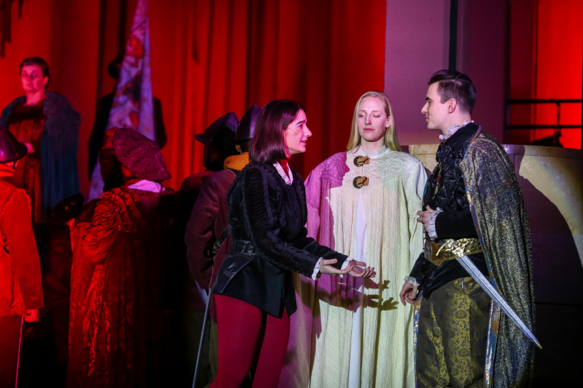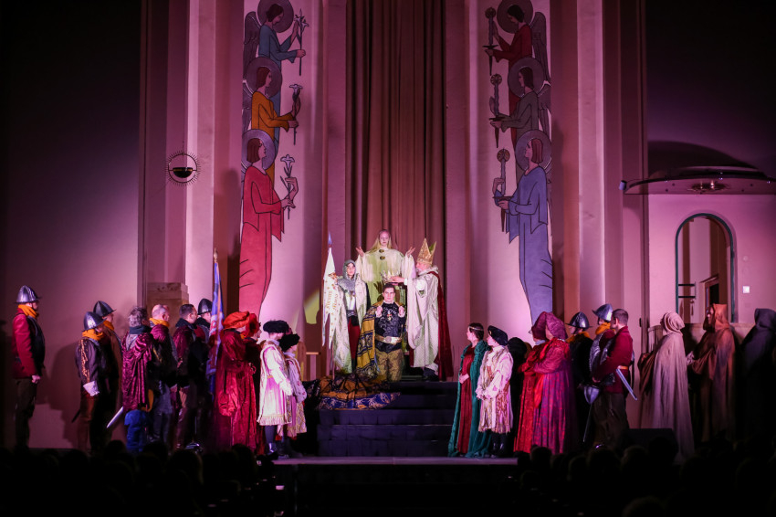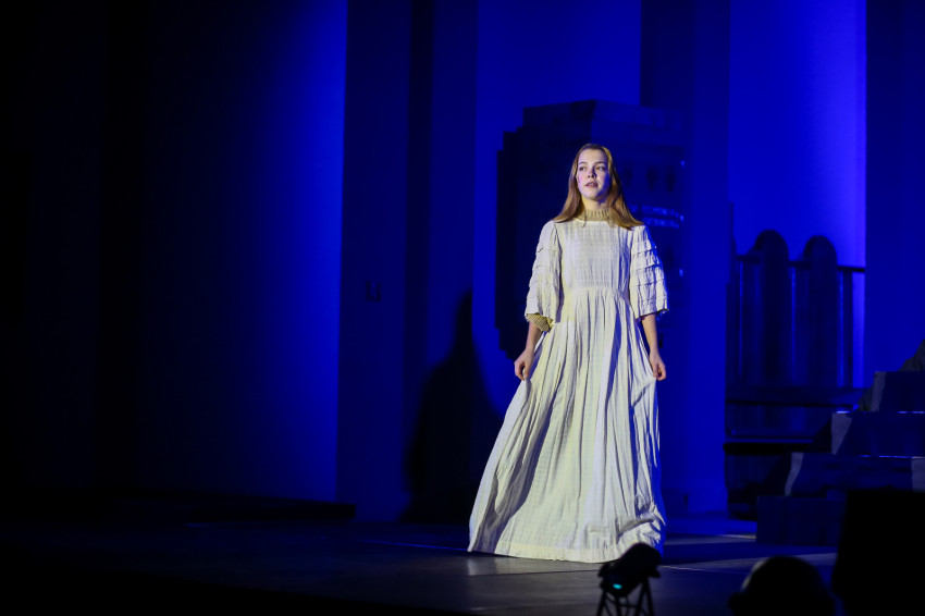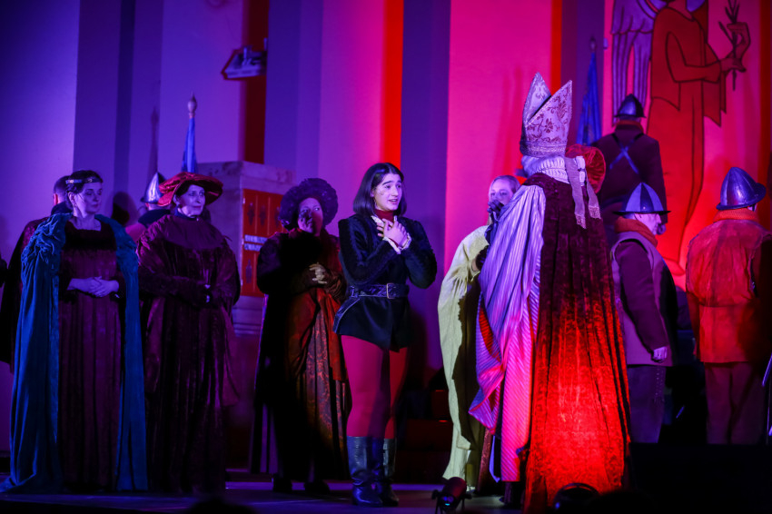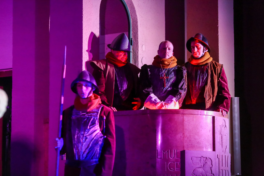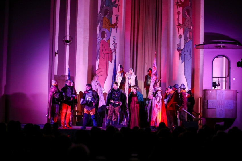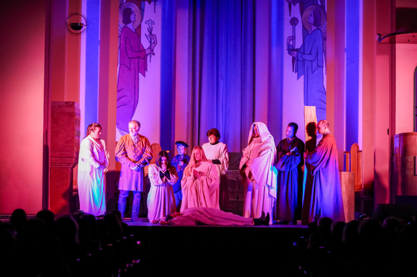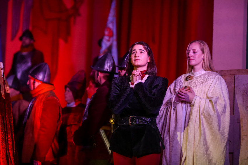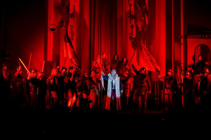 A misztériumjátékot mintegy hatvan szereplő adja elő. Meskó Zsolt eredeti ötlettel megkettőzi Jeanne d’Arc személyiségét: az első Jeanne a cselekvő, míg a második mintha a mából emlékezne vissza a történtekre, üdvözült lélekként. A cselekvő Jeanne-t a tizenkilenc éves Ménesi Júlia játssza, nagy átéléssel. Elhisszük neki, hogy valóban Isten áll mögötte, az Úrból meríti erejét, minden mozdulata, hanghordozása hiteles. A visszaemlékező Jeanne hangja az ugyancsak tizenéves Meskó Borókáé. Érthetően, tisztán beszél, nem hadar, nem harapja le a szavak végét, úgy értelmezi a történteket, hogy minket is gondolkozásra késztet. A darab végén fölteszi a kérdést: „Uram, hallják még a hangodat? Uram, hallják még a hangunkat?”
