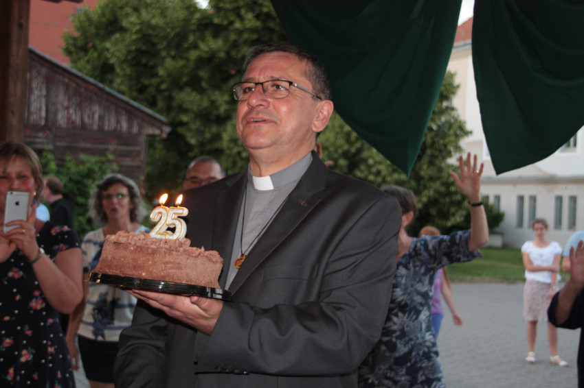 A szentmise végén ünnepélyes ezüstmisés áldásban részesültek a jelenlévők, majd kezdődött az agapé, az éneklés és a tánc. A sok köszöntés mellet Burbela Gergely is köszönetet mondott mindenkinek, mindenért. Tamási Áron erdélyi író szavait idézte: „Azért vagyunk a világon, hogy valahol otthon legyünk benne.” Gergely atya tanúságot tett arról, hogy bárhol is legyen a világban, ő az Eucharisztiában mindig otthon van.