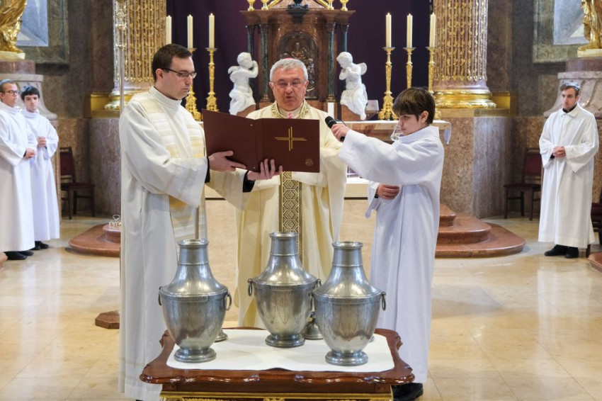 Nagycsütörtök délelőtt Veres András megyéspüspök olajszentelési szentmisét mutatott be a Győri Egyházmegye papságával a győri Nagyboldogasszony-székesegyházban. A főpásztor a szentmise keretein belül megszentelte a keresztelendők és a betegek olaját, valamint a krizmát. Az ünnepi szertartás során a papi ígéretek megújítására is sor került.