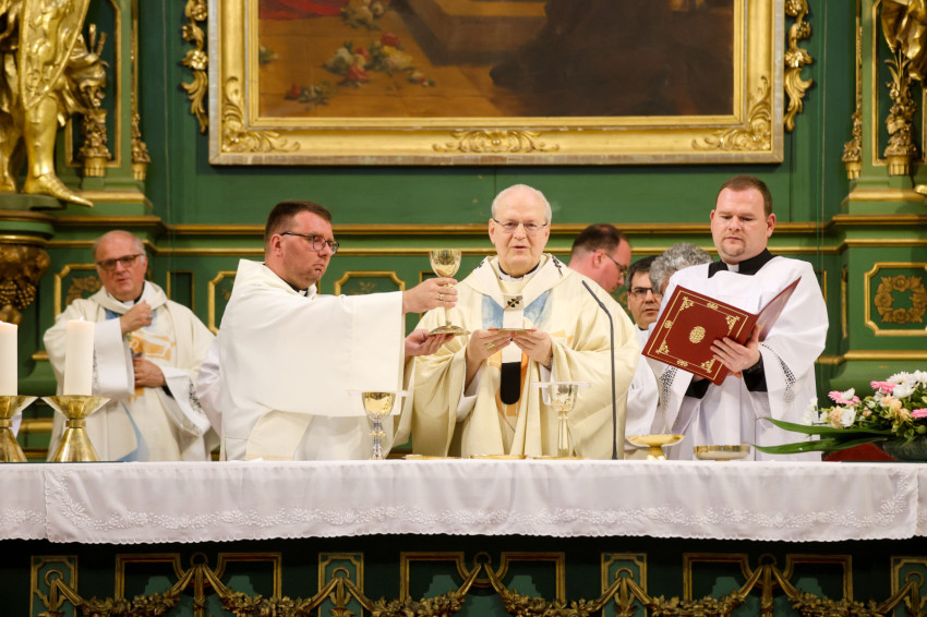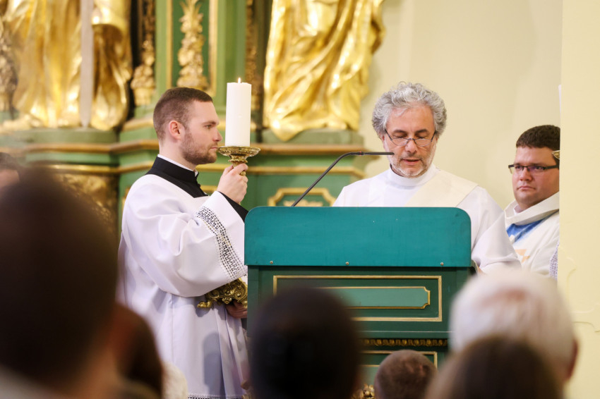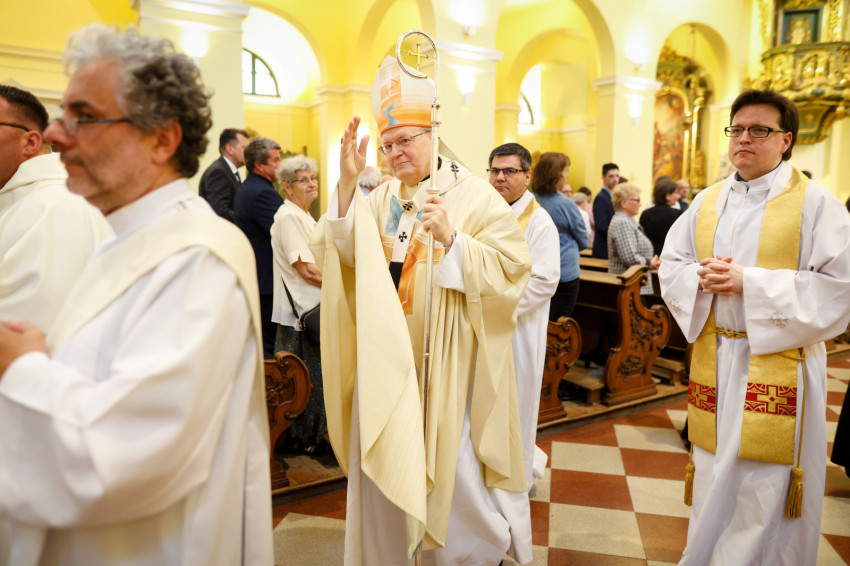 A szentmise elején Szkaliczki Örs OCist, a templom plébánosa köszöntötte a főpásztort és az ünneplő közösséget, megtiszteltetésnek nevezte, hogy ez a templom ad otthont ennek a szép hálaadó szentmisének, így az itteni plébániaközösség is kapcsolódik Ferenc pápa magyarországi látogatásához.