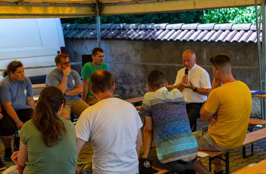 Délután Ailer Gellért, a Redemptoris Mater Missziós Szeminárium rektorhelyettesének tanúságtételét, elmélkedését hallgathatták meg a résztvevők. A lelkipásztor az első angyal és az első asszony közötti párbeszédet idézte fel, Lucifer és Éva történetét, amikor az ördög lépre csalja az embert, Isten iránti kételyt keltve.