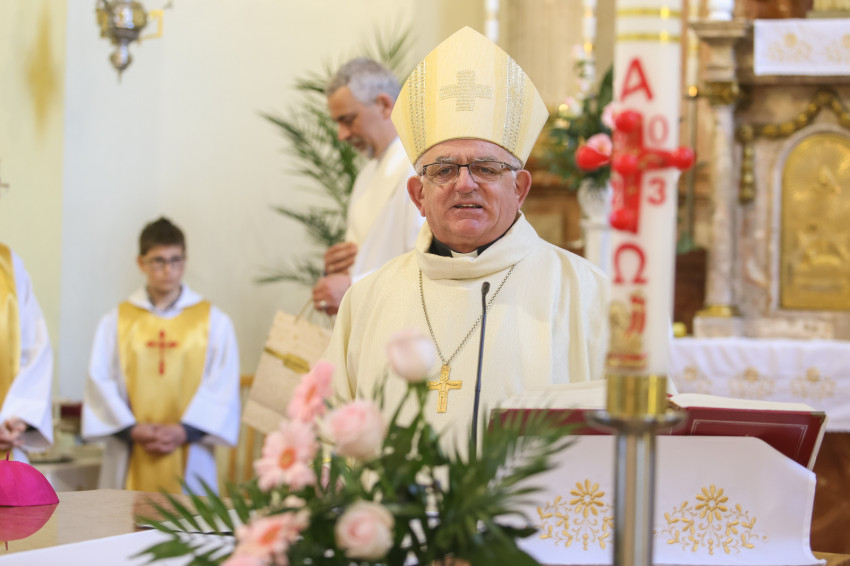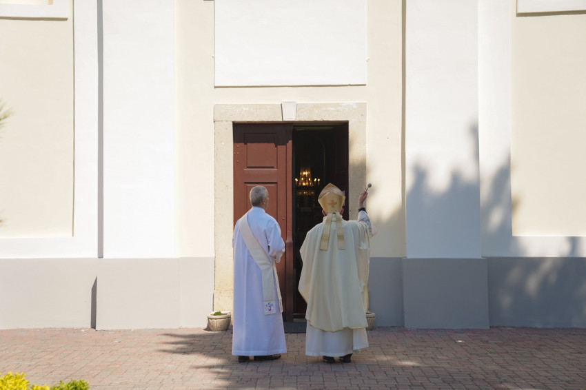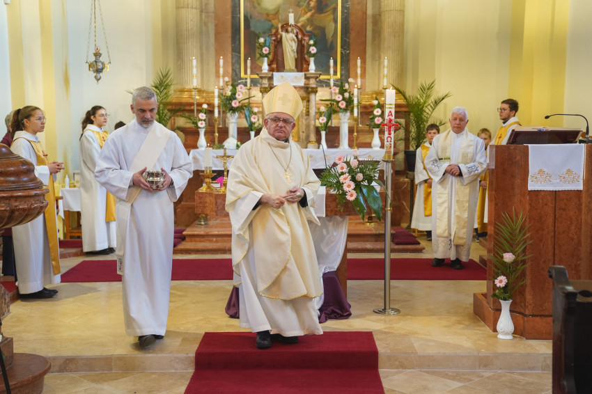 A búcsúi szentmise elején a főpásztor az áldás szavait követően szenteltvízzel hintette meg a templomot.