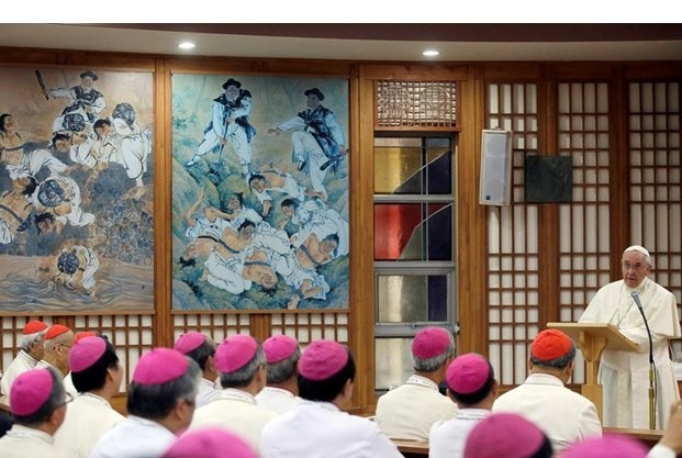 A helyi hatóságok és Daejeon püspöke fogadta a pápát. Angolul tartották meg a délelőtti imaórát. A kegyhely rektora fogadta Ferenc pápát a közel 400 ember befogadására alkalmas templom főbejáratánál. Az istentiszteleti helyen az egész Ázsiából érkezett püspökök és vendég főpásztorok várták a Szentatyát. Oswald Gracias bíboros, Mumbay érseke és az ázsiai püspöki konferenciák szövetségének elnöke köszöntötte a Szentatyát. A pápa beszéde után egyenként bemutatták neki a jelenlevő főpásztorokat.