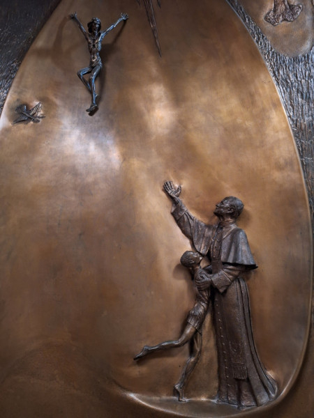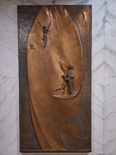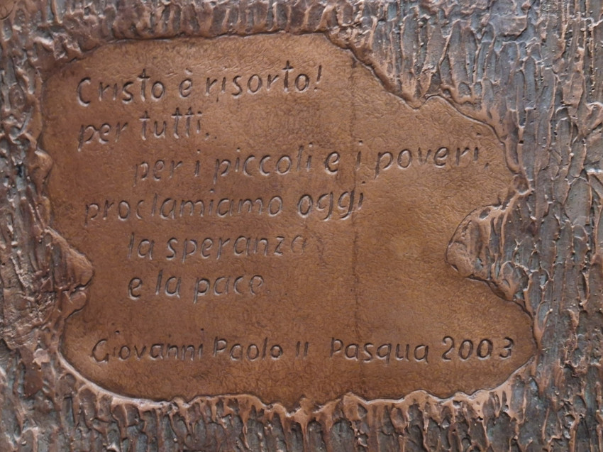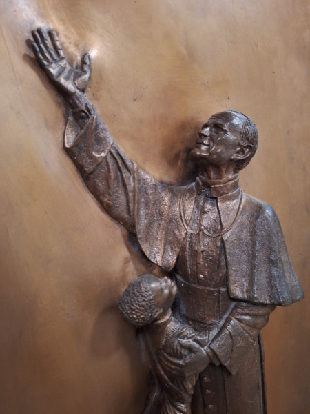 A sekrestye előtti folyosón, amikor a falra erősített hatalmas bronzplakettre tekintek, világosodom meg: ma van Szent II. János Pál pápa halálának 19. évfordulója, mert a dombormű éppen róla szól. Összeáll a kép és hozzáigazodik a szívem is. Lent a Magyarok Nagyasszonya-kápolnában három csoport is képviseli a magyarokat az anyaországból és Erdélyből. Mi más is lehetne a szentmise intenciója, mint hálaadás a „jó pásztor Karol Wojtyłáért”?!