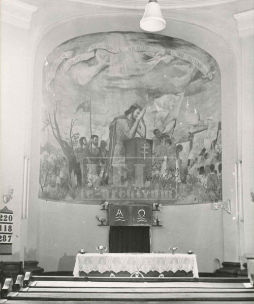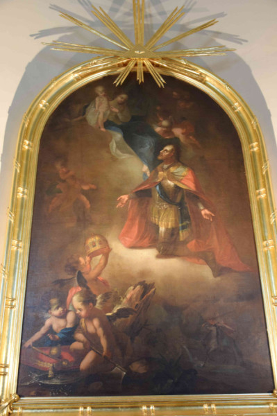 A templomnak a középkorból hagyományozódott védőszentje Szent László. A nagyméretű, kvalitásos festmény előterében vad sziklás tájban balra puttók foglalatoskodnak a szent királyra utaló tárgyakkal: egyiküknél a legendából ismert bárd, másikuknál a vörös bársony párnán elhelyezett koronázási jelvények, a jogar és az országalma. Mögöttük a harmadik puttó a Szent Koronát emeli a magasba. Jobbra a háttérben apró figurákat lehet felfedezni: a koronás Szent László lovas alakját, amint a sziklából vizet fakaszt, a háttér mélyén csatajelent.
