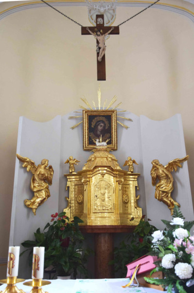 Itt helyezték el a kegyhely régi Szűz Mária-képét (ismeretlen olasz mester munkája, szinten az Eszterházy család adománya), előtte egyszerű oszlopot formázó vörös márvány posztamensen aranyozott, faragott fa, barokk pasztofóriumot. Ennek két oldalán az adoráló angyalok szobrának pozíciója emlékeztet az eredeti elrendezésre, „lebegő” helyzetük szerencsés megoldással, modern eszközökkel ad többlettartalmat a régi műtárgyaknak. Az együttest kisméretű stációképek, Szecskó Tamás érzékeny grafikái, illetve Varga Imre kovácsolt vas húsvéti gyertyatartója egészítik ki.