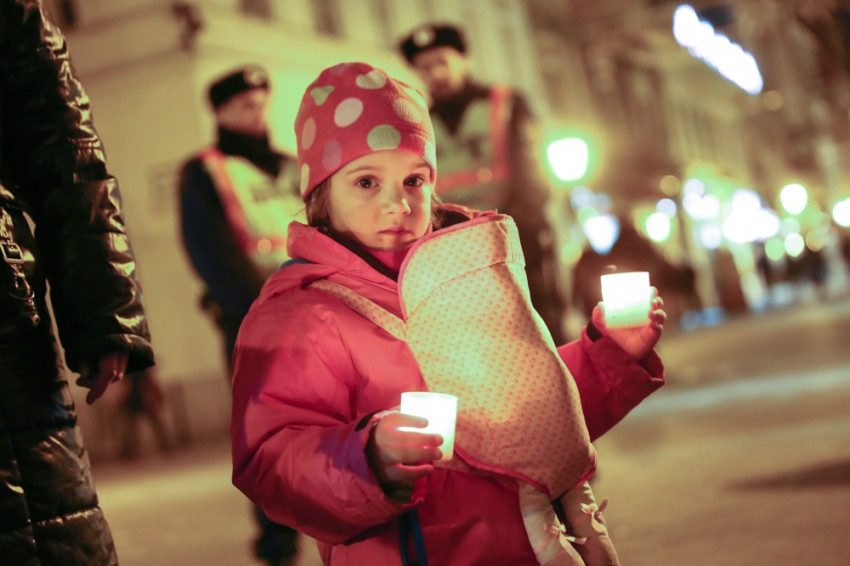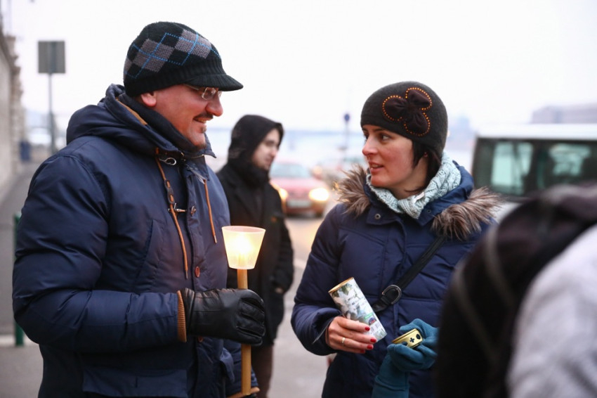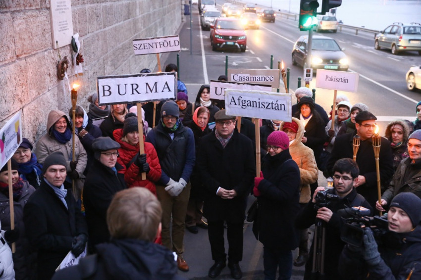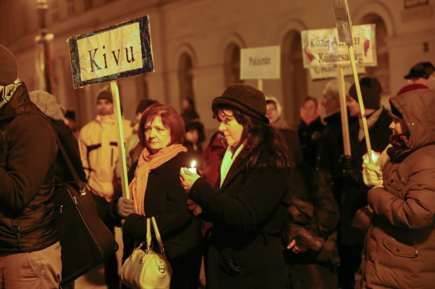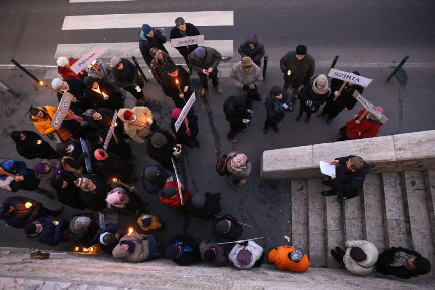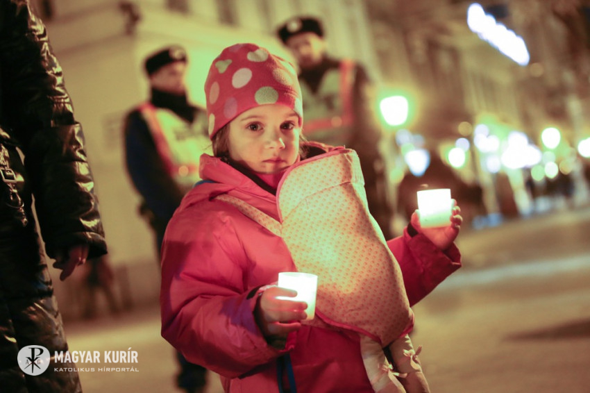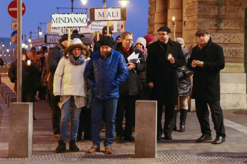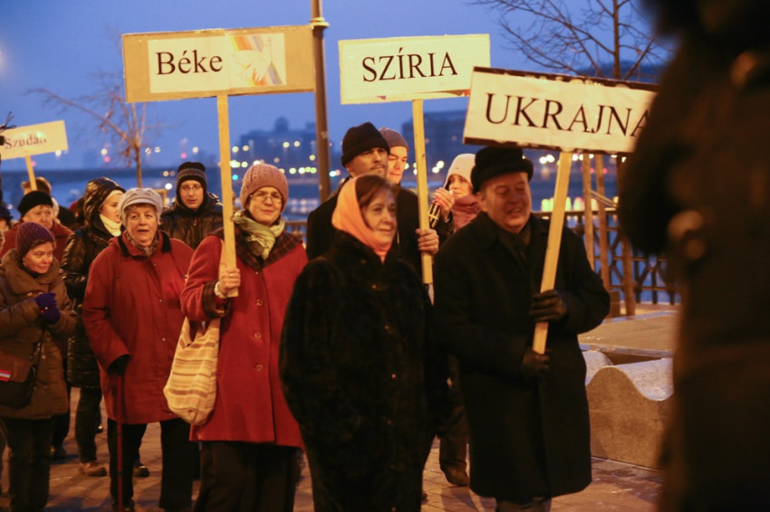 A résztvevők Budapesten a Salkaházi Sára rakparton, a vértanú szerzetesnővér emlékét őrző márványtáblánál gyújtották meg mécseseiket. Szőke Péter, a Szent Egyed közösség magyarországi vezetője felolvasta az Irgalmasság nagyobb, mint a közöny című békekiáltványt, amellyel közösségük csatlakozik Ferenc pápa szándékához. „Miközben a béke lépésével kezdjük az új esztendőt itt és a világ megannyi pontján, szeretnénk, ha Ferenc pápa felhívása meghallgatásra találna: »váljon az irgalmasság, a szolidaritás valódi életprogramunkká«. Vállaljuk, hogy ezt tettekre váltjuk azokból kiindulva, akiket Ferenc pápa üzenetében megjelöl: »az idegenekből, betegekből, foglyokból, hajléktalanokból«” – szóltak a felhívás szavai. A rakpartról a menet a Váci utcai Szent Mihály-templomig vonult fáklyákkal, mécsesekkel és transzparensekkel, amelyeken a háború sújtotta országok nevei szerepeltek.