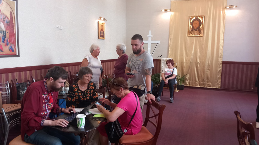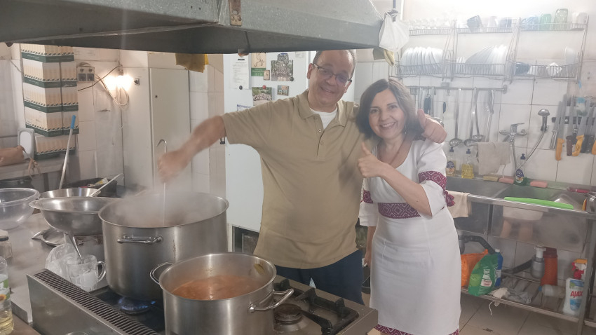 Szombaton – ami ünnepnap, a függetlenség napja volt Ukrajnában, ezért vannak sokan ünneplőben, népviseletben a fotókon – nekik főzünk gulyást nagy kondérban, miközben ők az irodákban fogadják a rászorulókat. A közösség minden héten háromszáz menekültnek ad segélyt, a regisztráció nyitott, bárki jelentkezhet. Aznap nem menekültek érkeznek, hanem nevelőszülős családok. Idővel sok menekült már berendezkedett, munkát talált, a közösség pedig igyekszik kiterjeszteni a segítséget a városlakókra is. Egyre nagyobb a szegénység, és mivel egymillió lakosú városról van szó, az önkormányzatot kérték, hogy jelöljék ki a leginkább rászorulókat, így kerültek a látóterükbe ezek a családok. Különösen nehéz helyzetben vannak a családotthonok, esetükben a saját gyerekek mellett nyolc-tíz nevelt gyereket kellett kimenekíteniük a keleti régiókból. Egy nevelőanya elmeséli, hogy otthon, Mikolajivban nagy gazdaságuk volt, mindent megtermeltek maguknak, itt pedig egy kis lakásban élnek, miközben befogadtak két újabb gyermeket is egy kényszerűségből feloszlatott zaporizzsjai intézetből.