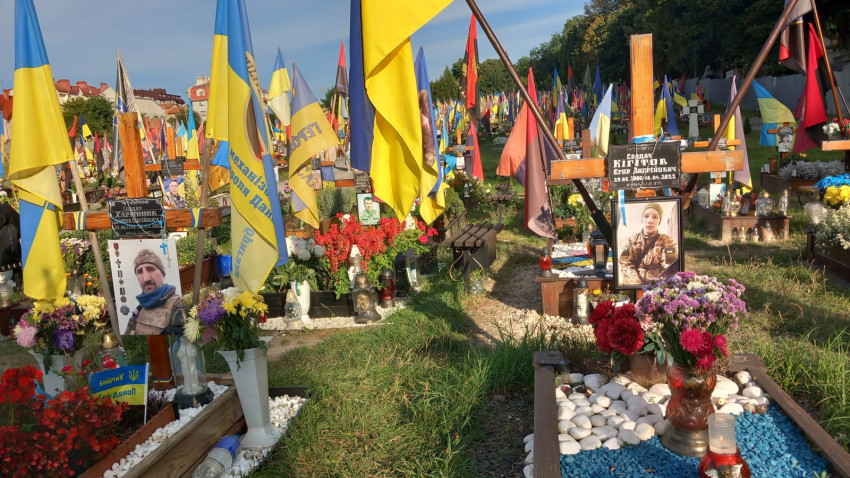 A katonai temető látványa olyan megrendítő, hogy szinte leírhatatlan: közel félszáz sír, friss virágokkal, zászlókkal, a fronton elesett férfiak arcképeivel. Katonai parcella, de ezek a fiúk, férfiak úgy néznek ránk a fotókról, mint a testvéreink, szüleink, gyerekeink... Közülünk valók, akik a hazájuk védelmében harcba szálltak.