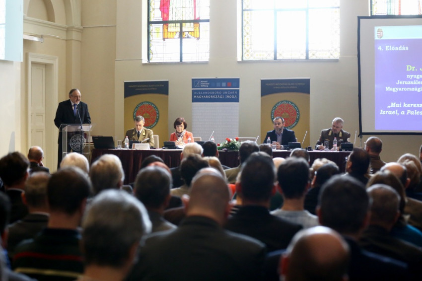 A Szentföldön – Izrael, a Palesztin Hatóság és Jordánia területén – élő keresztények aktuális helyzetét mutatta be Jungbert Béla nyugalmazott nagykövet, a Jeruzsálemi Szent Sír Lovagrend Magyarországi Helytartóságának vezetője. A keresztény közösségek megmaradásának drámai helyzetét számadatokkal igazolta. Hangsúlyozta a nyugati világ felelősségét, rámutatva, a keresztény közösség megmaradásának megteremtése a közel-keleti térségben a jelenlegi – politikai érdekek mentén történő fellépéssel – nem oldható meg.