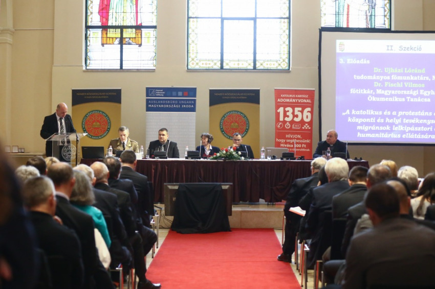 Ujházi Lóránd, az NKE tudományos főmunkatársa és Fischl Vilmos, Magyarországi Egyházak Ökumenikus Tanácsának főtitkára a katolikus és a protestáns egyházak központi és helyi tevékenységét mutatta be a migránsok lelkipásztori és humanitárius ellátásában.