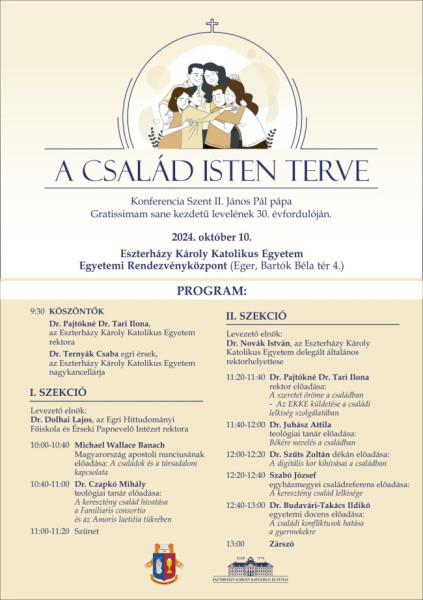 A Szent II. János Pál pápa Gratissimam sane (Levél a családokhoz) kezdetű apostoli levele születésének 30. évfordulója alkalmából szervezett konferencián a keresztény családok szerepéről, hivatásáról; a családi konfliktusok hatásáról; a szeretet és a békére nevelés fontosságáról, valamint a digitális kor kihívásairól hallhatnak előadásokat a résztvevők.