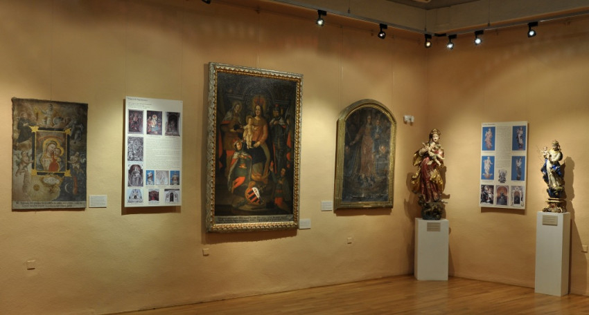 A kiállítás talán legnagyobb részét az ikonográfiai csoportok szerint bemutatott barokk emlékek teszik ki. Egy-egy, a kiállításra elhozható szobor vagy festmény illusztrálja az Európa-szerte elterjedt vagy éppen jellegzetesen magyar Mária-ábrázolások típusait. A 17. század elején Rómában előkerült, később Bécsben, majd a döblingi kármelita templomban őrzött Lehajtott fejű Mária-kegykép másolata több erdélyi templomban is megtalálható, ezek képviselője a tárlaton az alvinci ferences kolostor ábrázolása. A bulgarita ferencesek körösbányai templomában maradt fenn a legenda szerint albán eredetű, a Róma közelében fekvő Geneazzo Jótanács Anyja-kegyképének a másolata, de természetesen találkozunk jóval közismertebb típusokkal is: az ún. Győzedelmes Immaculátát a kiállításon a somlyói kegytemplom 18. századi szobra képviseli, de a Segítő Boldogasszony-ábrázolásának egyik kiemelkedő minőségű, a brassói ferences templomban fennmaradt példája, vagy a mariazelli kegyszobor másolatai is megtekinthetőek, illetve számos más, 18–19. századi ábrázolástípus is fellelhető a kiállításon.