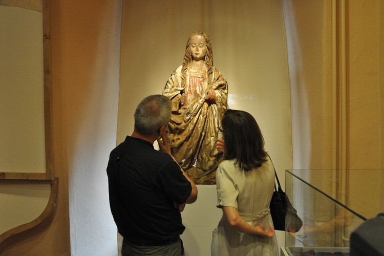 Maga a tárlat önmagáért beszél. A kronologikus és tematikus rendben bemutatott emlékek, érthető módon nem teljességre törekvő, mégis átfogó képet nyújtanak az erdélyi Mária-tisztelet főbb állomásairól. A legelső, a késő gótikus és reneszánsz időszakot bemutató teremben a látogató pillantását belépéskor egy oltárrekonstrukció ragadja meg. Szekrényében a csíksomlyói Madonna-szobor eredeti méretre nagyított fényképe látható, annak két oldalán pedig, a szekrényt keretező, úgynevezett „vierer-szobrok” közül kettő található: a csobotfalvi templomból a Csíki Székely Múzeum tulajdonába került Borbála- és Katalin-szobrok, amelyek az újabb feltételezések szerint egykor a Madonna-szoborral azonos oltárban állhattak. A terem másik, és egyúttal az egész kiállítás egyik fő látványossága, mondhatni szenzációja, a vágási templom padlásáról frissen előkerült, minden kétséget kizáróan a 16. század első évtizedeire keltezhető faragott Mária-ábrázolás, amely talán egy Mária koronázását megjelenítő kompozíció központi része lehetett. Eredeti származási helyéről sajnos egyelőre nincs információ, azonban töredékes volta, sérült felülete, erősen megkopott festése ellenére is jól látható, hogy jól illeszkedik a kor német hatás alatt álló erdélyi faszobrászatába.