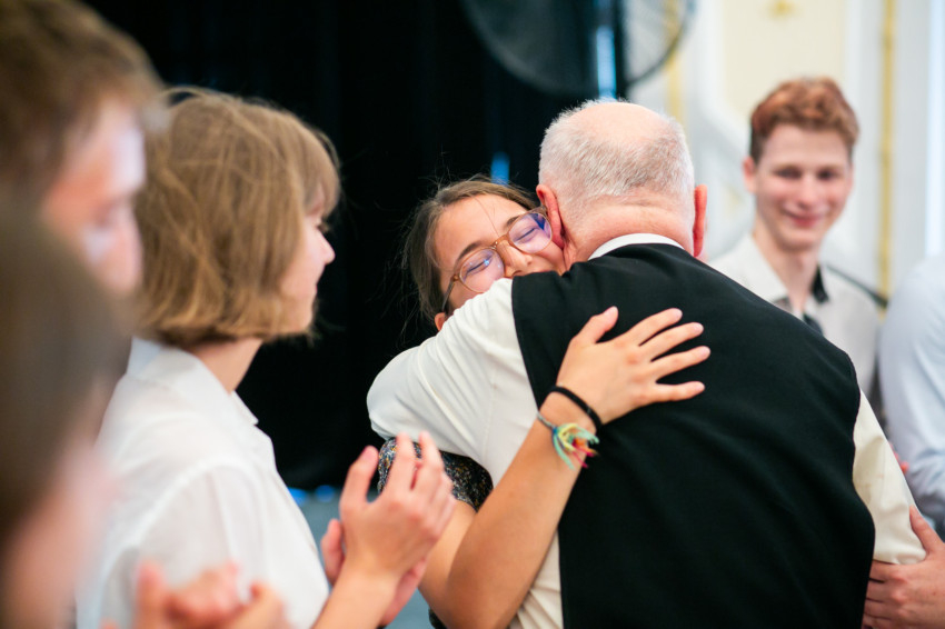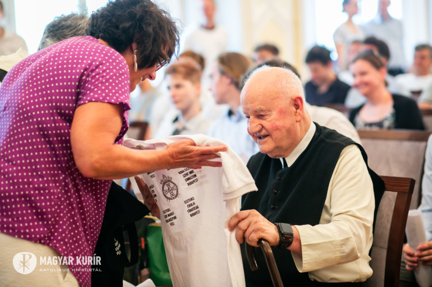 Az idén ballagó diákok nevében a 13 B osztályos Márton búcsúzott Marton Bernáttól. Nyolc évvel ezelőtt találkoztak vele, és azonnal megszerették. Ettől kezdve rendszeres, szoros volt a kapcsolatuk. Marton Bernát részt vett a szalagavatójukon is. Korábban kétszer is tartott nekik lelkigyakorlatot. Márton idézett Ady Endre Elválunk című verséből: „Elválunk most már. Te is elmégy, én is. / Hogy összeforrott a sorsunk mégis.” Az idős szerzetest búcsúztató tanuló hozzátette: az évek során az ő osztályuk is összeforrt Marton Bernáttal, és ezt már nem szedheti szét senki.
