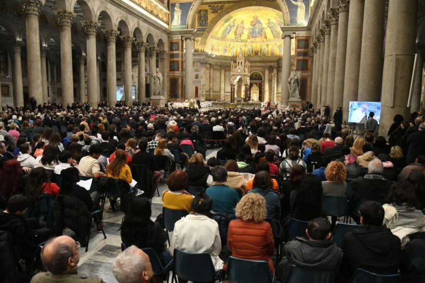 Matteo Zuppi bíboros a sziklára épített ház evangéliumi történetének felolvasását követően homíliájában kifejezte örömét, amiért a hatalmas bazilika még kicsinek is tűnik, olyan sok ember gyűlt össze hálaadásra a rengeteg ajándékért, amely a közösségen keresztül sokak életét fénylővé, boldoggá tette. „Egy nagy, egyetemes nép, az alázatosok és szegények népe, akik dicsérik az Urat, mert ingyen és érdem nélkül annyi jó vizet kaptak tőle. Olyan vizet, amely oltja a szomjat, sőt, magát a szívünket is forrássá teszi.”