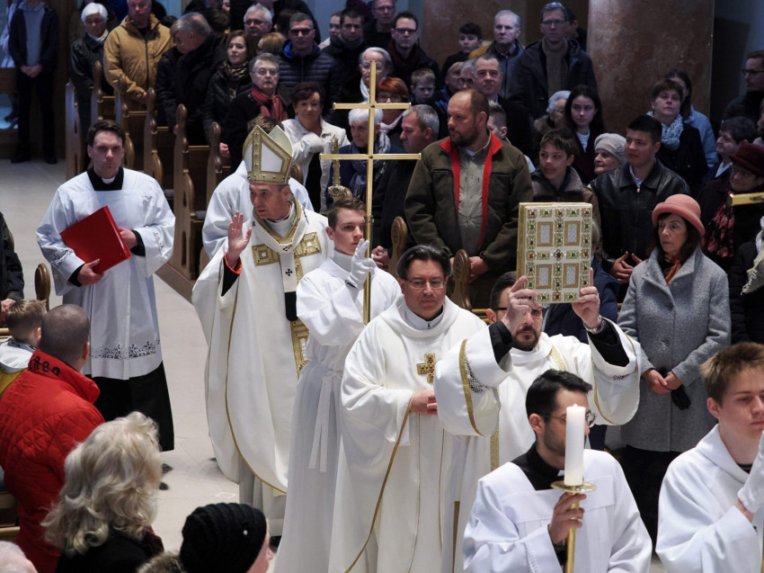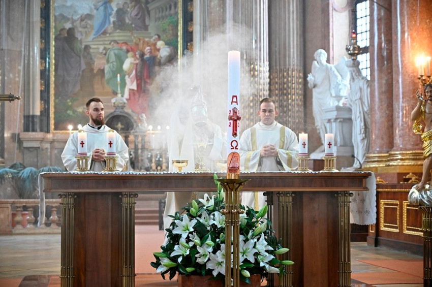 A szombathelyi székesegyházban Fekete Szabolcs Benedek püspök Császár István plébánossal és az egyházmegye papnövendékeivel mutatott be szentmisét húsvét napján.