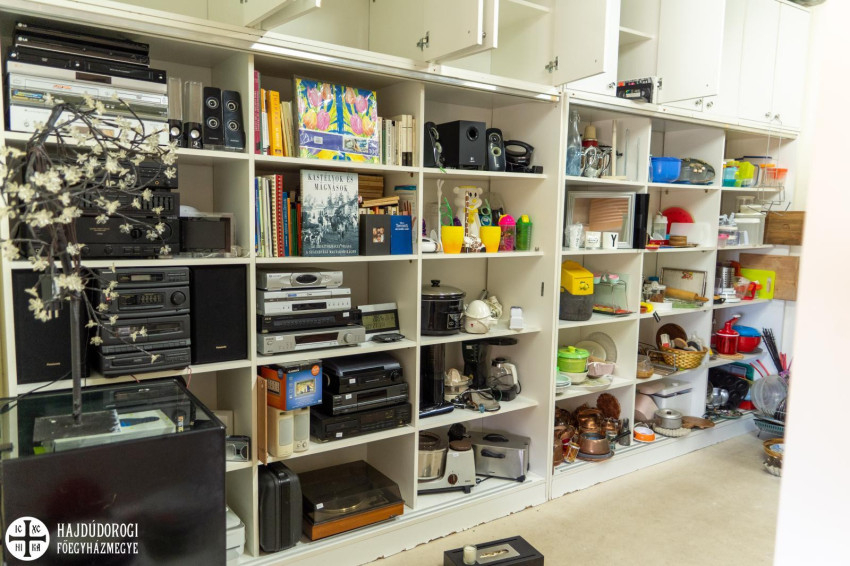A második teremben konyhai eszközök, kisebb elektronikai berendezések, világítástechnikai eszközök, könyvek sorakoznak.