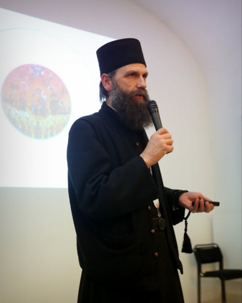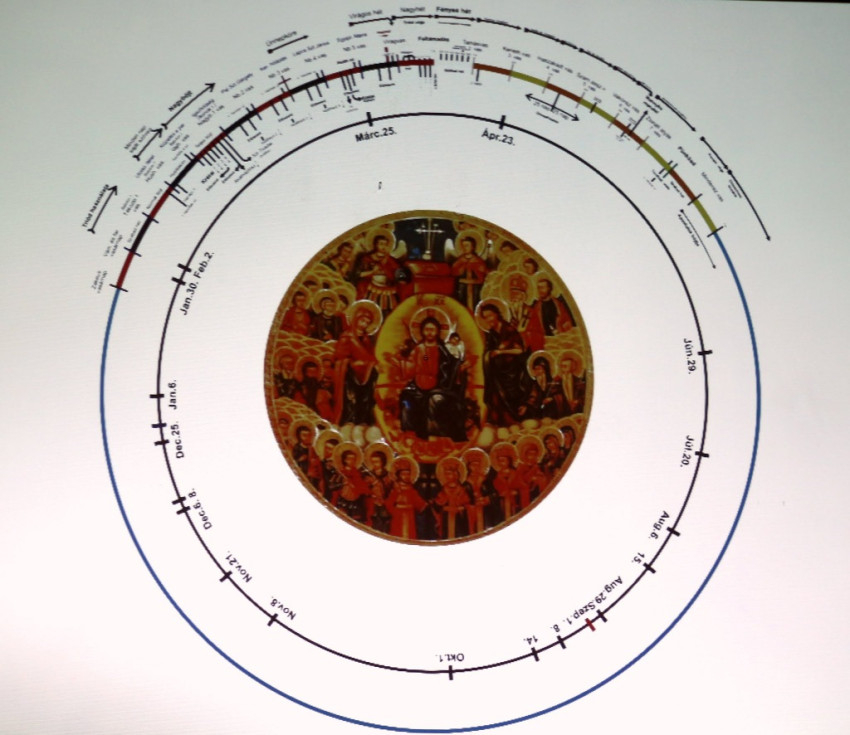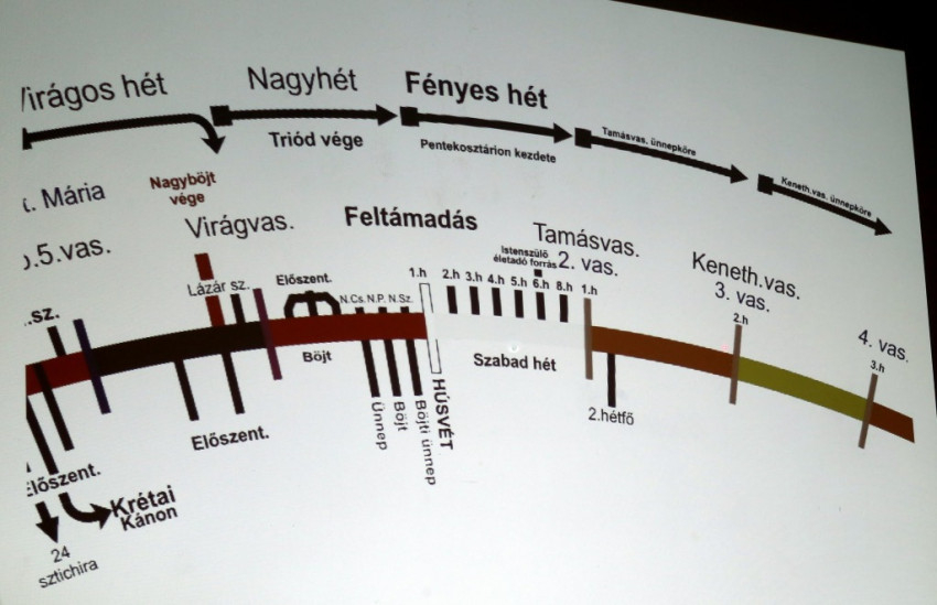 Kocsis Fülöp vetítéssel kezdte előadását. A képen kör – az évkör, azaz az idő, az esztendő – látható, amelynek közepén Jézus Krisztus foglal helyet. Hogyan viszonyulunk mi, időhöz kötött emberek Istenhez? – tette fel a kérdést a metropolita, s válaszolt is rá: a köríven haladunk egyik napról a másikra. A kör közepén a Teremtő Isten – Krisztus egyszerre éli ezt meg, egyszerre látja, mi fog velünk történni, nem kizárólag a múltunkat, amire mi magunk is vissza tudunk emlékezni. A folyamat, ami az életünket meghatározza az Isten számára, egyetlen pillanat, melyet a kör közepéről egyszerre tud áttekinteni.